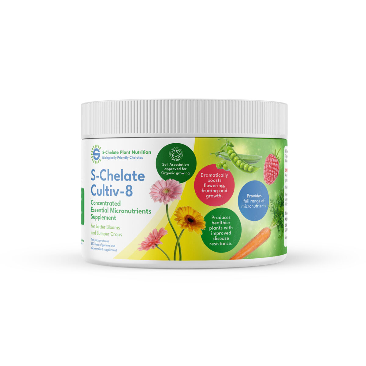 S-Chelate-O Cultiv-8 is a concentrated Plant Health and Growth Booster. Supplied in completely water-soluble powder form, it contains 8 of the most important micronutrients and is Soil Association approved for Organic Growing. It is designed to work with organic composts or on established plants by enhancing and unlocking available naturally occurring nutrition.