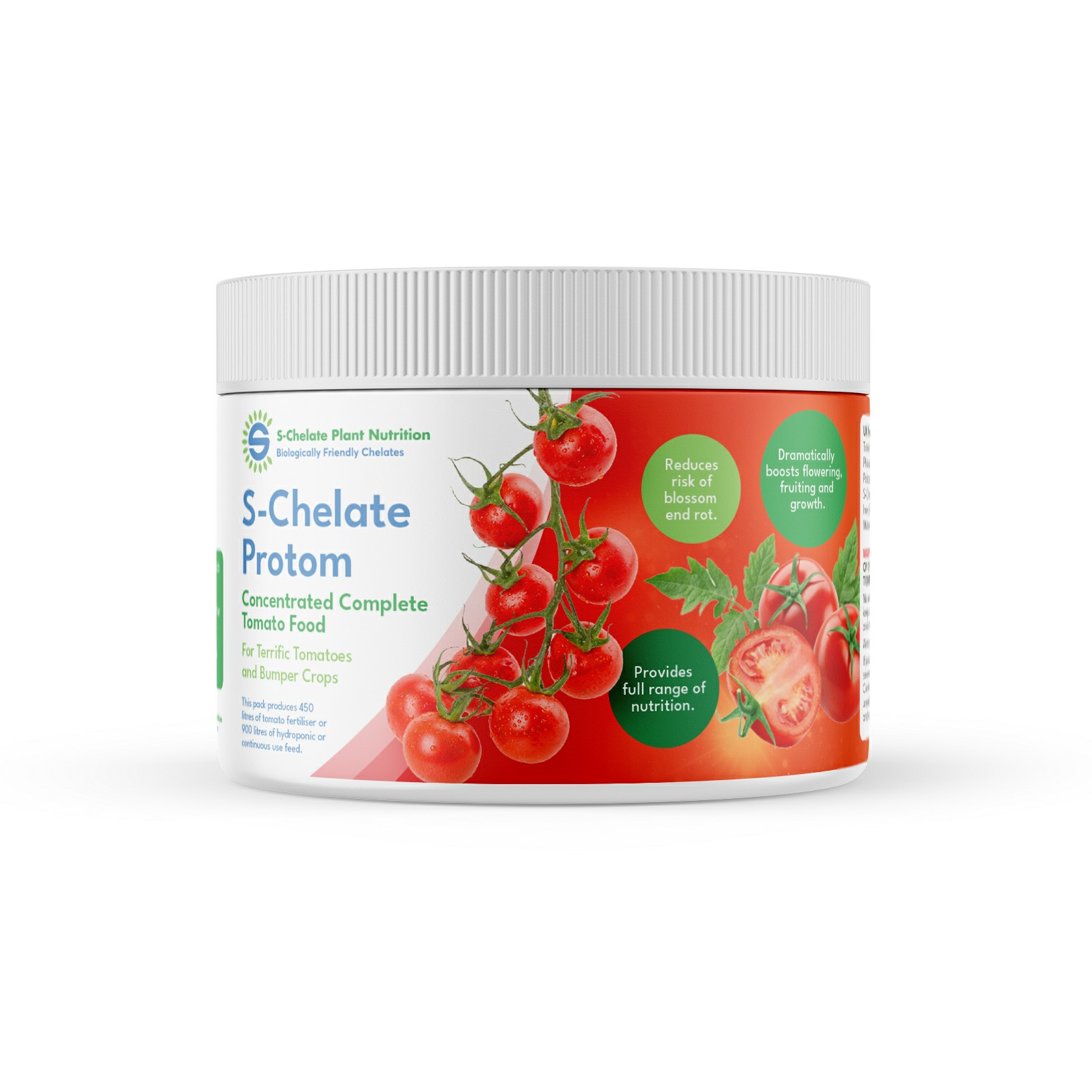 S-Chelate Protom is a Super Concentrated Professional Tomato Fertiliser. Formulated to provide a complete tomato feed with the perfect balance of macro and micro nutrients to maximise the production of great quality, healthy fruits.